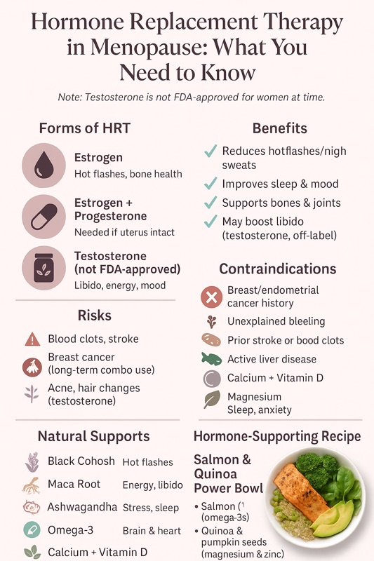 This article explores the different types of HRT, including estrogen, progesterone, and testosterone, highlights the benefits and risks, reviews natural supplement options, and offers a hormone-supporting meal recipe.